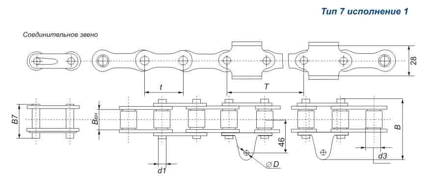 Транспортерные роликовые длиннозвенные цепи ТРД Тип 7 исполнение 1 используются для транспортеров с креплением к горизонтальному двойному специальному элементу цепи с одной стороны, резины или другого элемента транспортера. У данного исполнения крепление спецэлементов, на внешней пластине цепи.